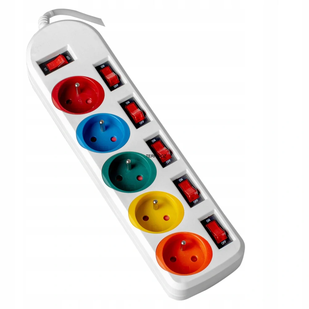 2metrový bílý prodlužovací kabel s pěti barevnými zásuvkami a nezávislými vypínači